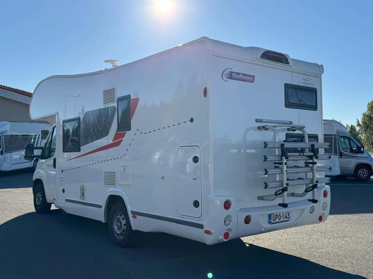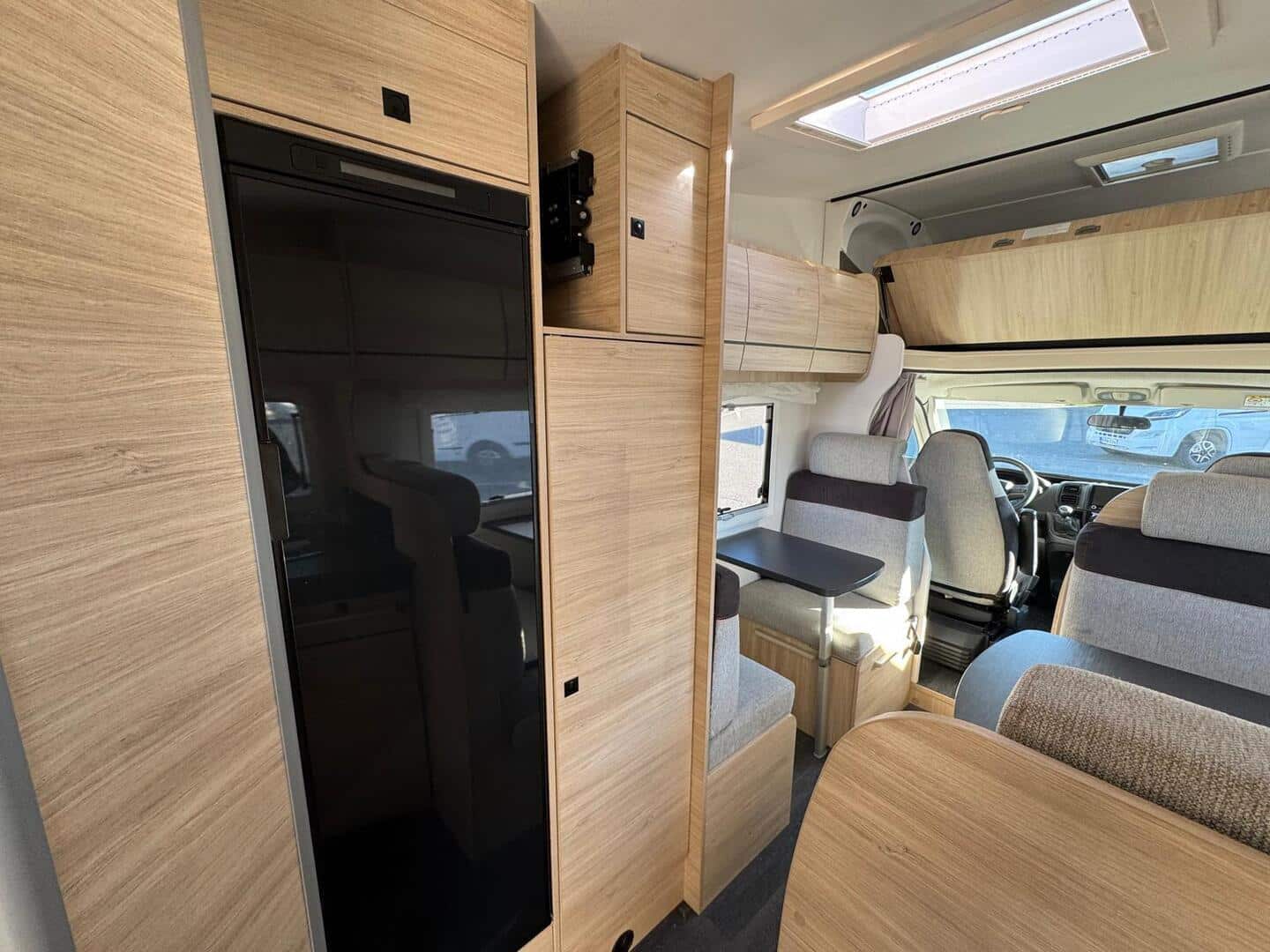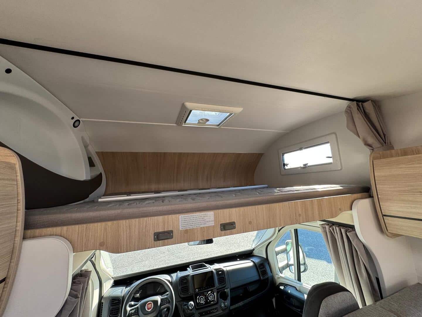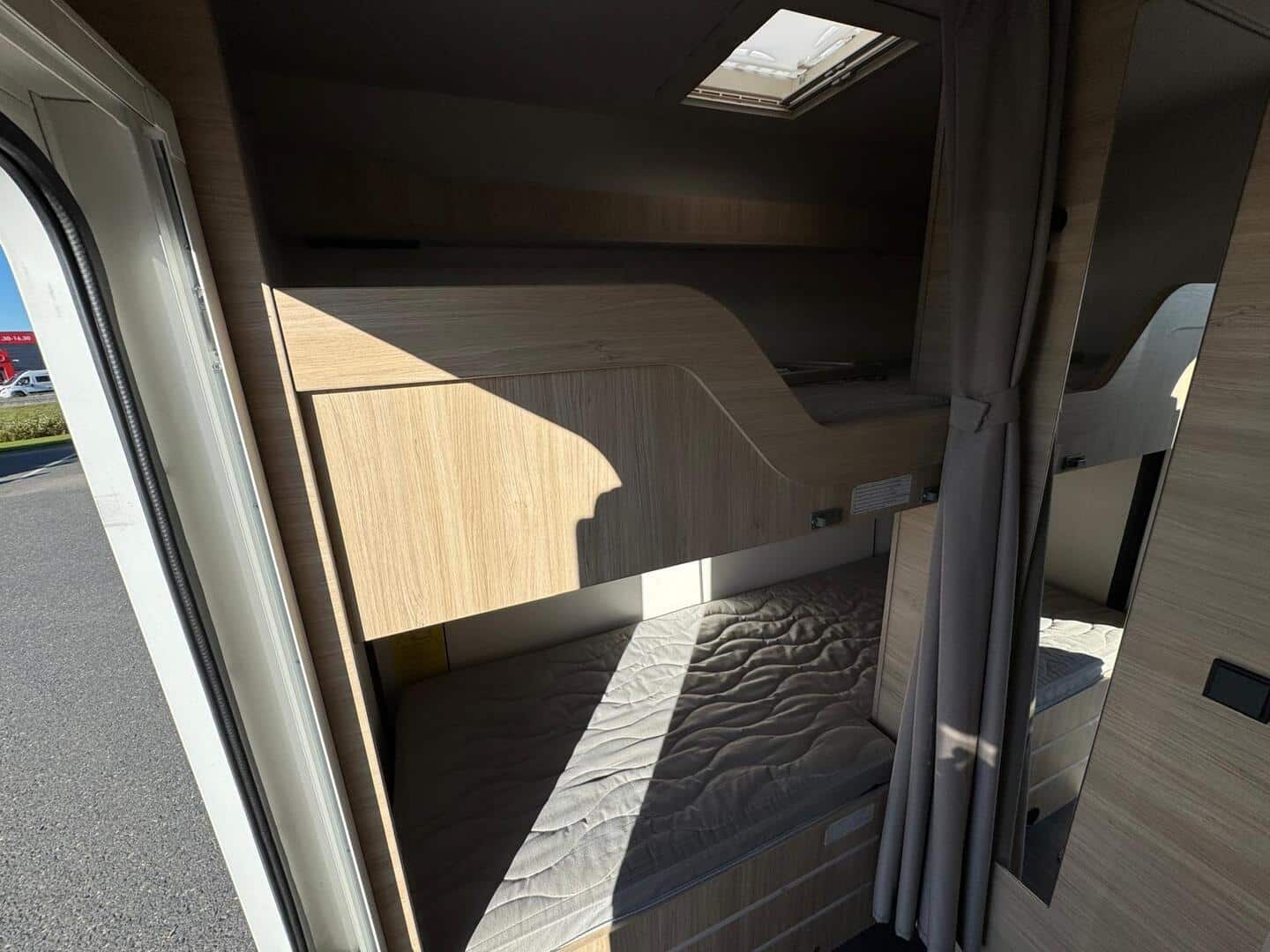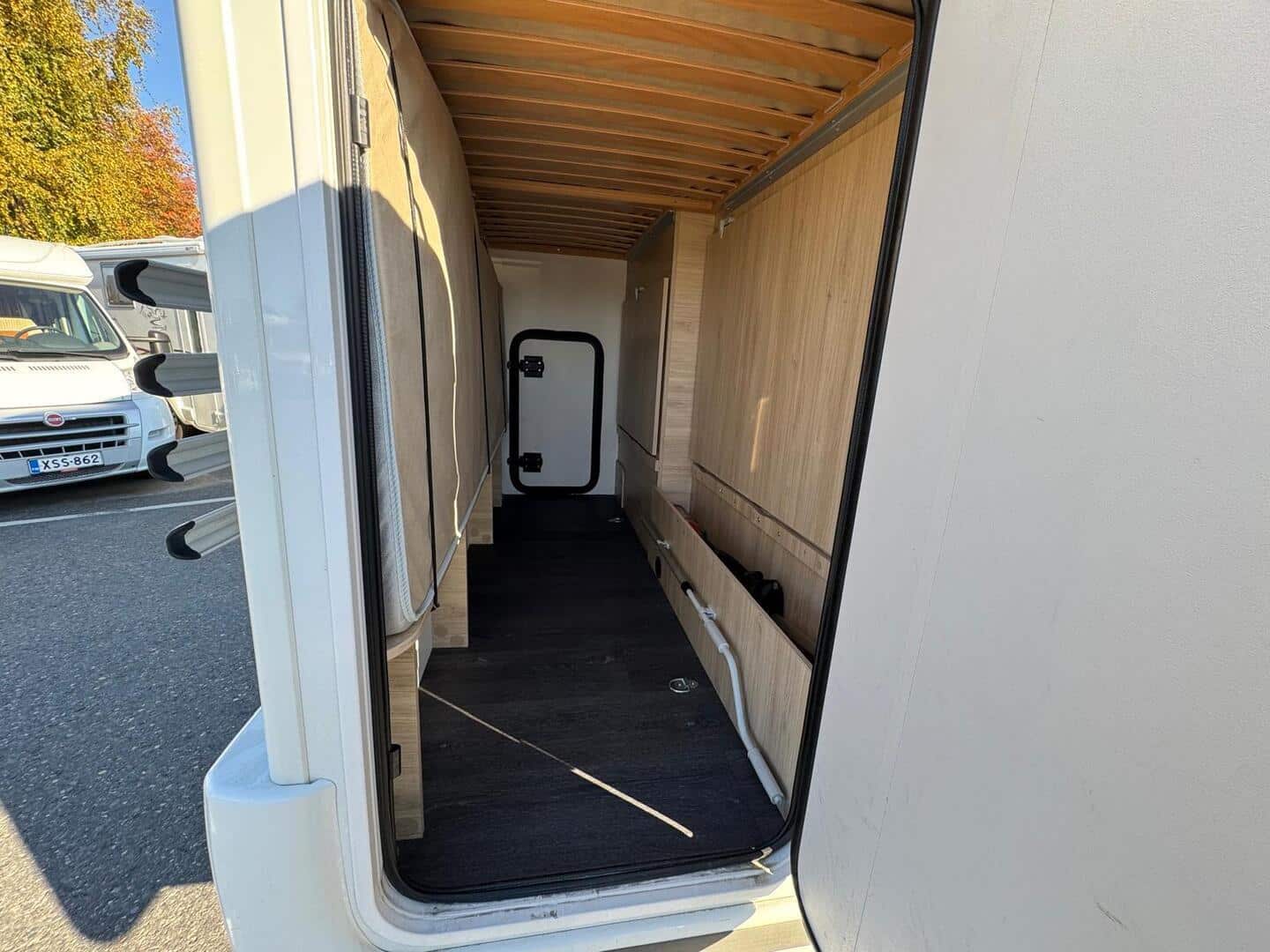 Takaosassa poikittainen kerrossänky, ruokailuryhmästä saa sängyn kahdelle ja ohjaamon päällä tilava 160 cm leveä parisänky. Iso takatalli (luukut kummallakin sivulla). Talliin mahtuu reilusti tavaraa ja esim. polkupyörä helposti ilman purkamista. Autoja saatavissa 2 kpl.