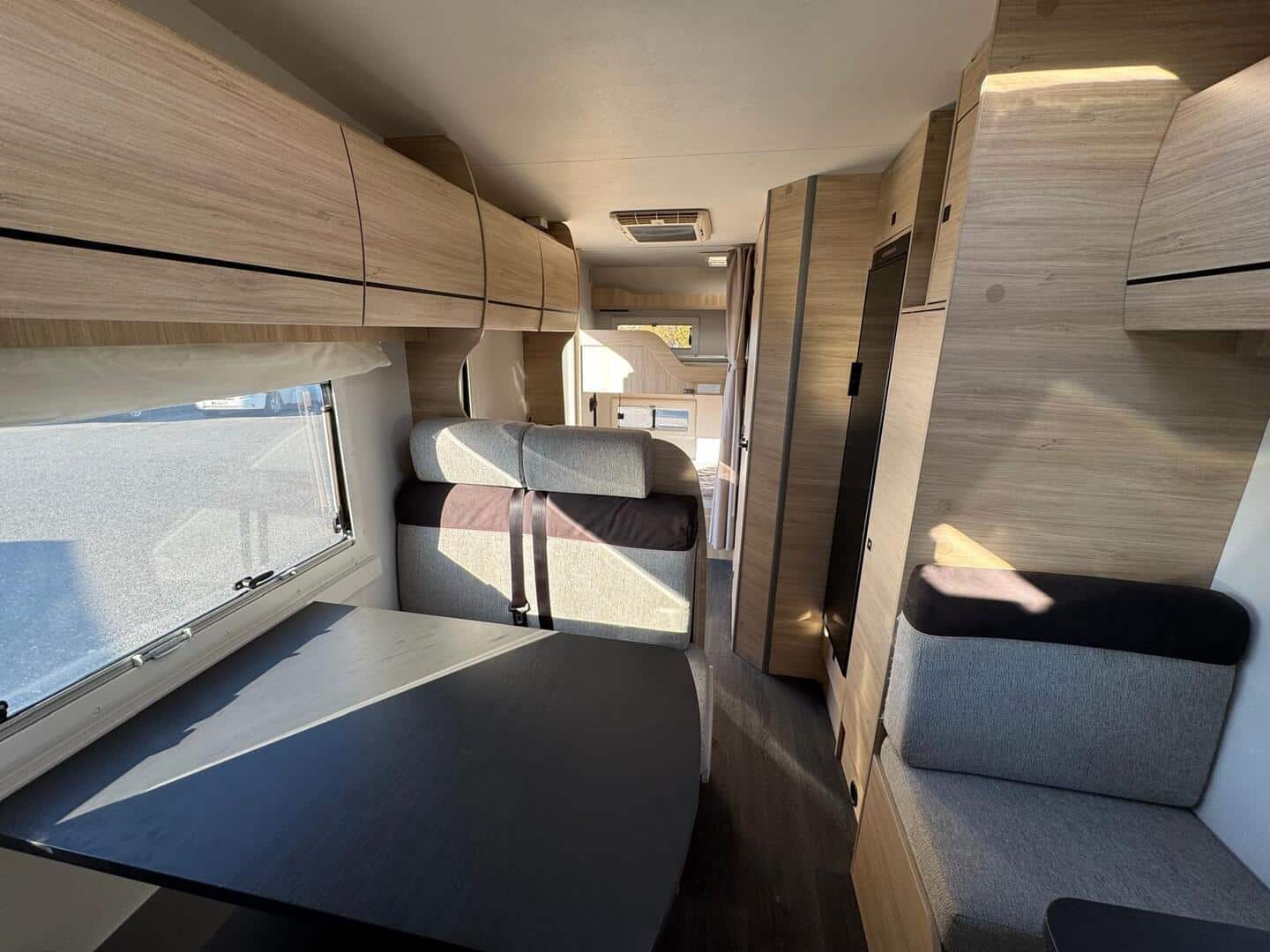 Takaosassa poikittainen kerrossänky, ruokailuryhmästä saa sängyn kahdelle ja ohjaamon päällä tilava 160cm leveä parisänky. Iso takatalli (luukut kummallakin sivulla).